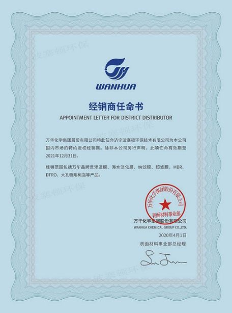 鑒于濟(jì)寧波塞頓環(huán)保技術(shù)有限公司卓越的水處理技術(shù)服務(wù)能力,經(jīng)過(guò)嚴(yán)格的考察與考核后,萬(wàn)華化學(xué)特授權(quán)濟(jì)寧波塞頓環(huán)保技術(shù)有限公司為萬(wàn)華化學(xué)膜產(chǎn)品的經(jīng)銷(xiāo)商。